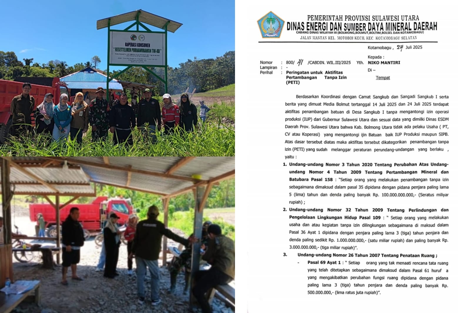 Kepala Dinas ESDM Sulut, Fransiscus Maindoka, menegaskan bahwa operasi tambang milik Nico Mantiri tidak mengantongi Izin Usaha Pertambangan (IUP) maupun Surat Izin Penambangan Batuan (SIPB) dari Gubernur Sulut.