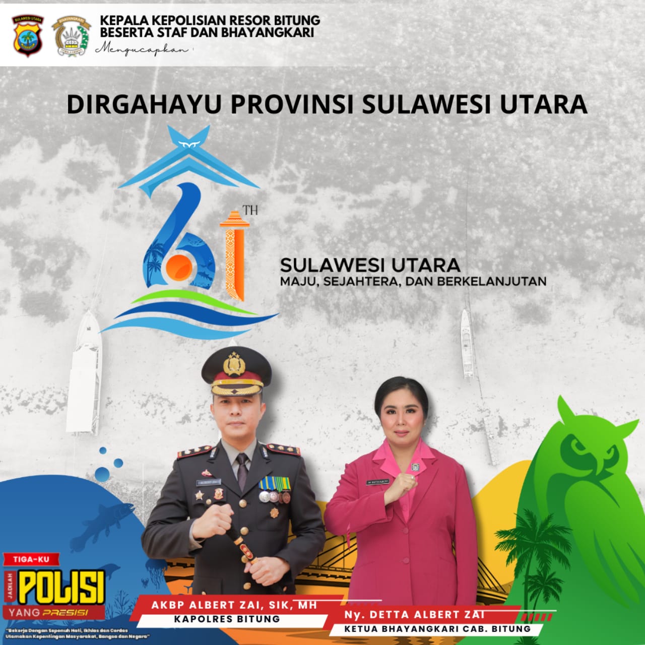 BITUNG-channelnusantara.com-Humas Polres Bitung-Kapolres Bitung, AKBP Albert Zai, SIK., MH, beserta staf dan Bhayangkari mengucapkan Dirgahayu Provinsi Sulawesi Utara yang ke-61. Ucapan ini disampaikan sebagai bentuk rasa bangga dan cinta kepada Provinsi Sulawesi Utara yang telah berkembang dan maju, Selasa 23/9/2025.