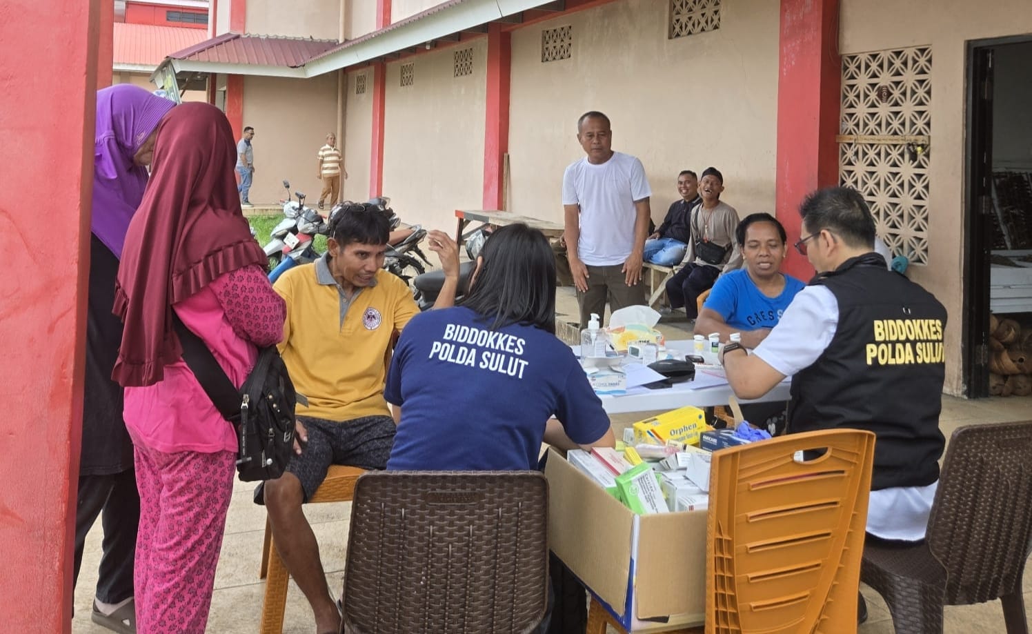 Kegiatan yang dimulai pukul 09.00 WITA ini dipimpin oleh dr. Victor W. Tumbuan selaku penanggung jawab, didampingi oleh Kasi Kesehatan Bripka Fauzan Wahibu serta Perawat Mitra Apri E. Marampa, Amd.Keb. Tim kesehatan Polres Bitung memberikan layanan pemeriksaan dan pengobatan gratis kepada masyarakat umum yang hadir di lokasi.