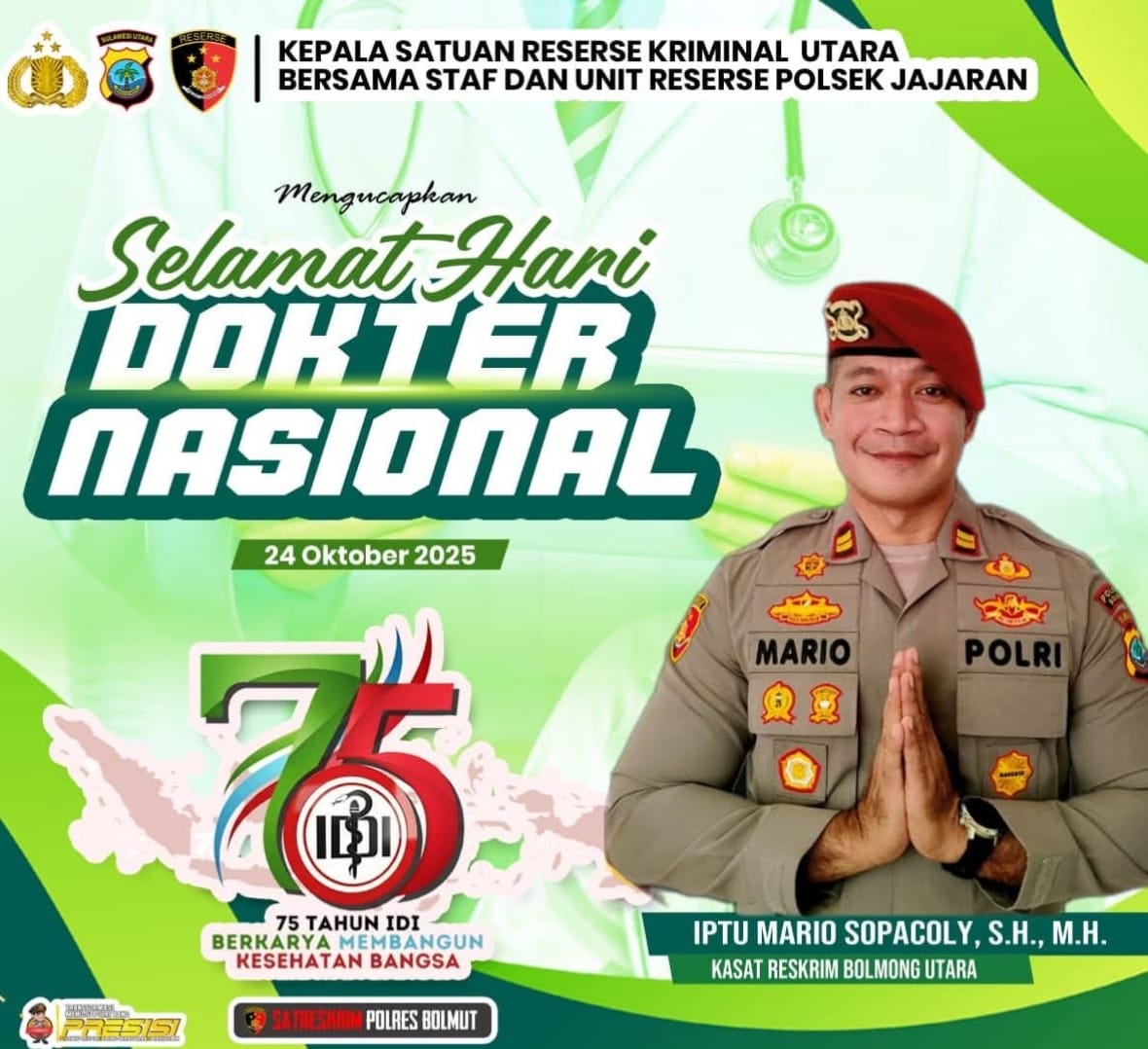 Bolmong Utara-channelnusantara.com-Kepala Satuan Reserse Kriminal (Kasat Reskrim) Polres Bolaang Mongondow Utara IPTU Mario Sopacoly, S.H., M.H., bersama seluruh staf dan personel Unit Reserse Polsek jajaran, menyampaikan ucapan Selamat Hari Dokter Nasional, yang diperingati setiap tanggal 24 Oktober.