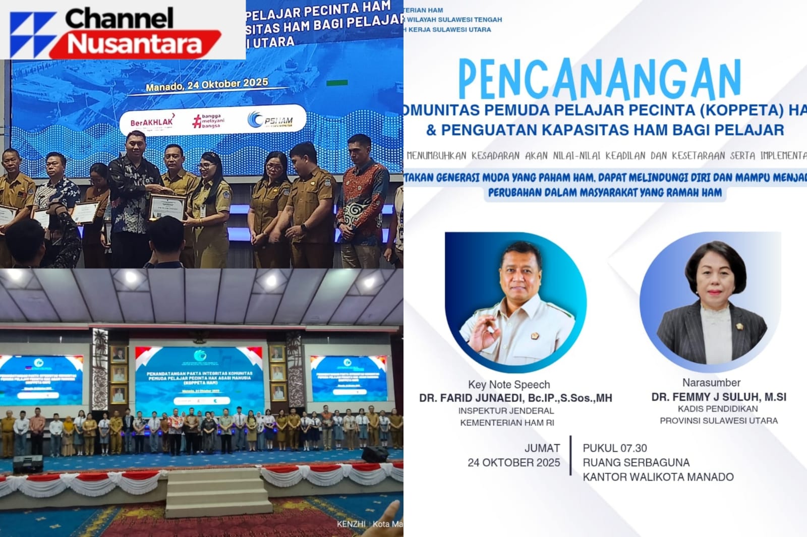 Manado-channelnusantara.com-Kementerian Hukum dan Hak Asasi Manusia (Kemenkumham) Republik Indonesia melalui Kantor Wilayah Sulawesi Tengah, Wilayah Kerja Sulawesi Utara, mencanangkan Komunitas Pemuda Pelajar Pecinta HAM (KOPPETA HAM) sekaligus menggelar Penguatan Kapasitas HAM bagi Pelajar, Jumat (24/10/2025) di Ruang Serbaguna Kantor Wali Kota Manado.