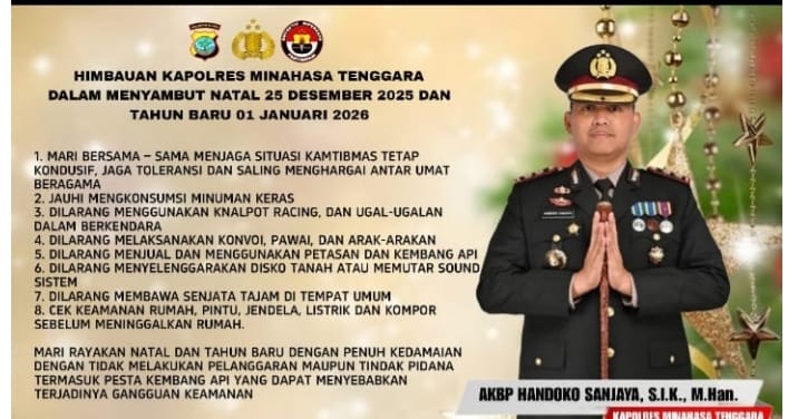 Mitra-channelnusantara.com-Menjelang perayaan Hari Raya Natal 25 Desember 2025 dan Tahun Baru 1 Januari 2026, Kapolres Minahasa Tenggara AKBP Handoko Sanjaya, S.I.K., M.Han., mengeluarkan himbauan kepada seluruh masyarakat agar bersama-sama menjaga situasi keamanan dan ketertiban masyarakat (kamtibmas) tetap aman, tertib, dan kondusif.